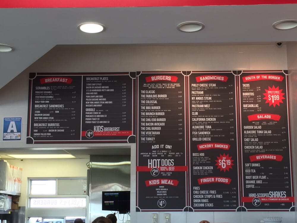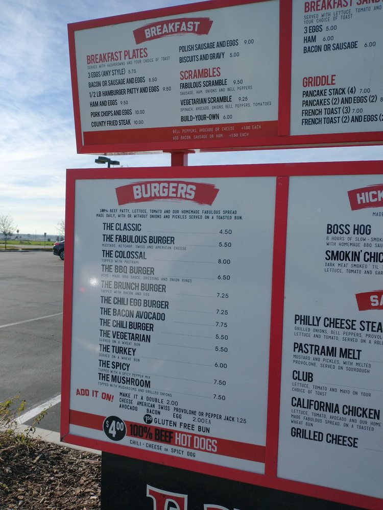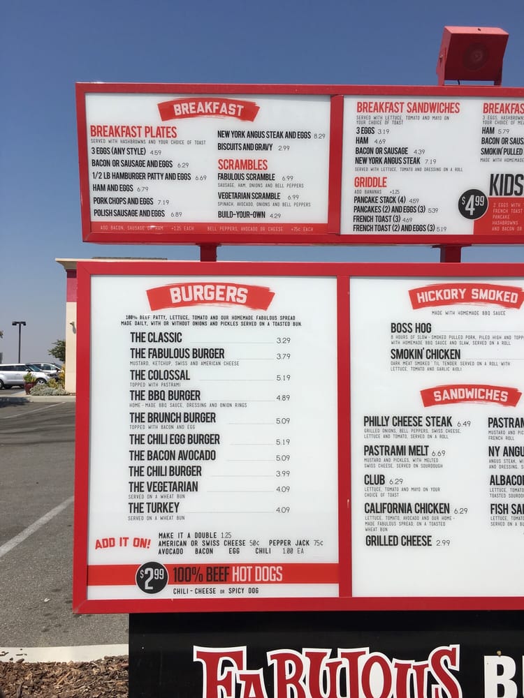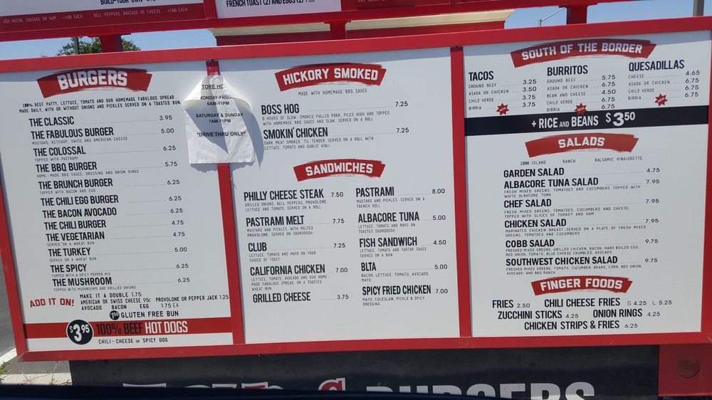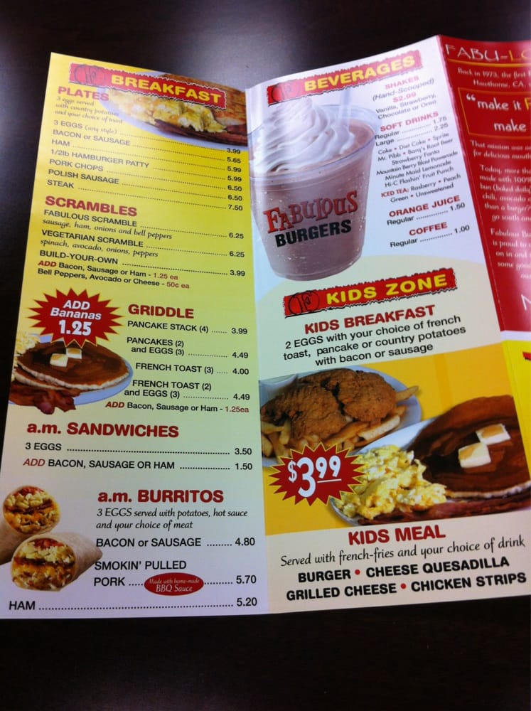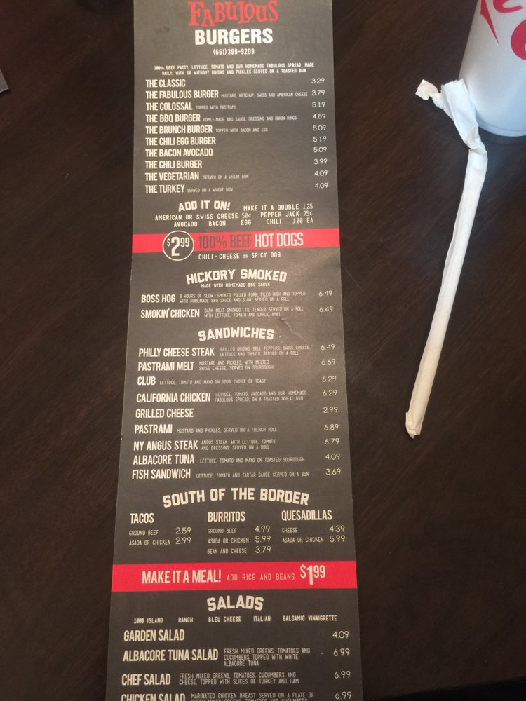 Introducing the menu at Fabulous Burgers, located in Bakersfield, CA, where they offer a variety of delicious options. From classic burgers like The Classic and Cheese Burger to special creations like The Colossal Burger and The Brunch Burger, there's something for every burger lover. Vegetarians can enjoy options like The Vegetarian Burger, while those craving a hot dog can choose from classics like the Hot Dog or a Chili Cheese Dog. Kids can also enjoy meals like the Kids Burger or Kids Chicken Strip. The reviews rave about the cleanliness, friendly staff, and delicious food. With options for delivery, takeout, and even catering, Fabulous Burgers is a must-visit spot for tasty and satisfying meals.